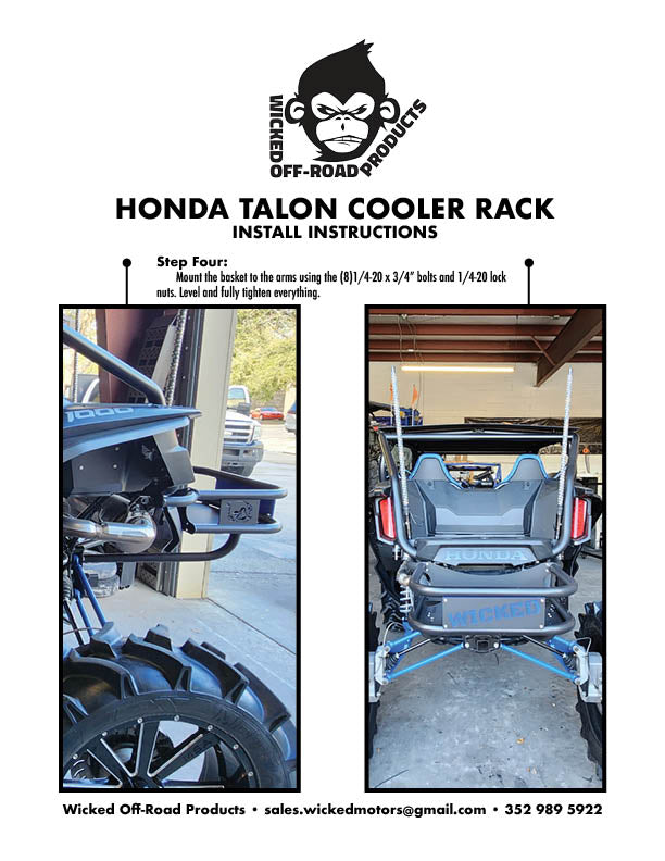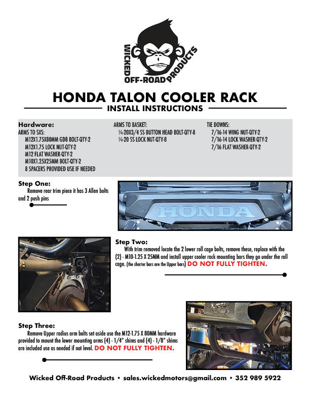 Experience confidence and durability with the Honda Talon Back Cooler Rack by Wicked Motorsports (WOP). Proudly crafted in the USA, this high-quality cooler rack boasts a sturdy 1 1/2 in. diameter and 1/8 in. thick tubing construction, making it perfect for even the toughest terrains. With an easy installation process, all hardware is included for a seamless fit on your Honda Talon. Add a personalized touch with custom colors and a personalized message on the rear plate. Elevate your off-road adventures with this exclusive accessory.